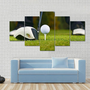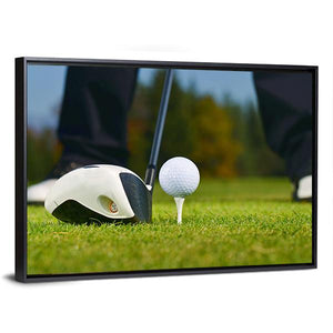 This captivating canvas features a focused golfer poised to strike, capturing the excitement of the game. The close-up perspective showcases the golf club head and ball, set against lush green grass, evoking a sense of anticipation and readiness.
