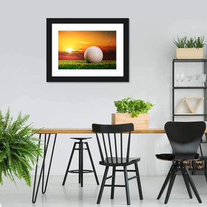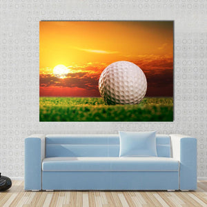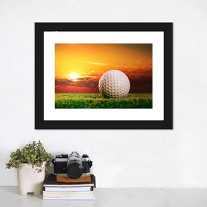 This canvas art captures a golf ball nestled in lush grass against a vibrant sunset. The serene blend of orange and green evokes a peaceful atmosphere, making it a lovely addition to any space admired for its natural beauty.