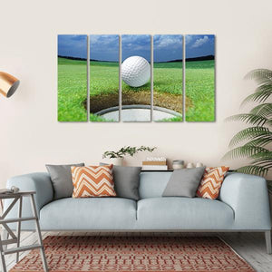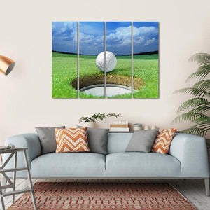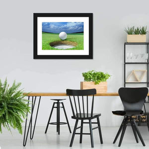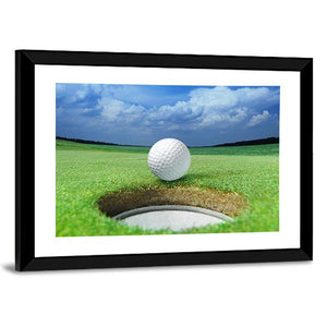 This canvas art captures a dimpled golf ball near the hole, surrounded by a serene golf course. The tranquil colors of green and blue, accompanied by fluffy clouds, create a peaceful atmosphere that invites focus and hope.