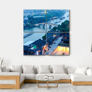 Experience the serene beauty of the Gongchen Bridge at dusk, where traditional architecture meets tranquil waters. This stunning canvas features arched bridges and gently illuminated boats, surrounded by a peaceful palette of blues and greens.