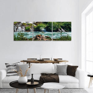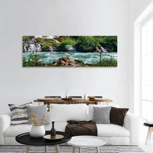 Schleierfall Waterfall Panoramic Canvas Wall Art shows a waterfall and river flowing over rocks with lush greenery, captured with a long-exposure blur that softens the water. The scene feels serene and vibrant, in blues, greens, browns, and whites, and works well in modern, nature-inspired rooms as a calm focal piece.