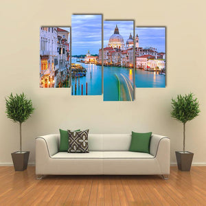 An evening view of Venice’s Grand Canal and the Basilica Di Santa, rendered as a realistic cityscape with boats and ornate domes. Blues, white, gold and brown tones plus long-exposure light trails on the water give a serene, picturesque yet vibrant feel. Suited to modern living rooms or entryways that favor architectural scenes.