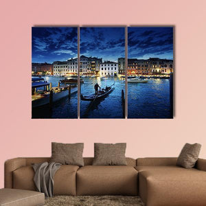 Grand Canal In Sunset depicts Venice’s Grand Canal at dusk, a photorealistic view of a gondola passing lit buildings under a clouded night sky. The blue, white and yellow palette gives the scene a serene, romantic, nocturnal feeling. Suited to modern living rooms or bedrooms as subtle wall decor.