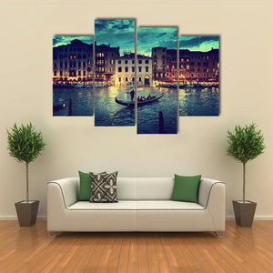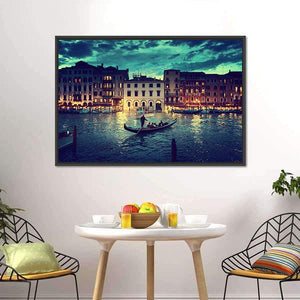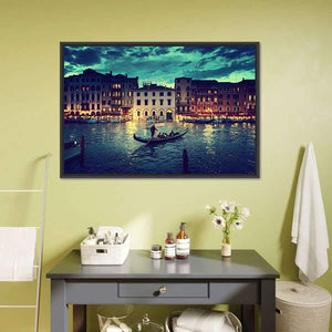 Capture the serene beauty of the Grand Canal in Venice, where a gondola gently glides beneath a moody, cloudy sky. The canvas art features a rich palette of blue, teal, yellow, and brown, making it a striking addition to any room decor.