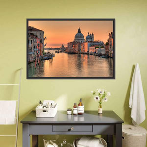 A panoramic, photo-realistic view of Venice’s Grand Canal at sunset, rendered in warm oranges, pinks and browns. The print features the skyline with two large domes, buildings in a row and boats on the water, giving a serene, picturesque mood. It makes a warm, scenic focal point for rooms that need a calm accent.