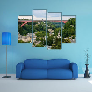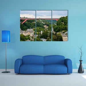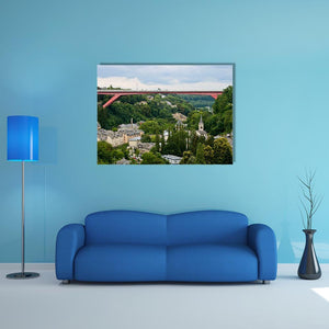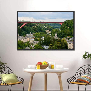 This peaceful canvas art captures an overhead view of the Grand Duchess Charlotte Bridge, surrounded by a serene valley and charming town. The vibrant palette of red, green, and gray brings a refreshing touch to any space.