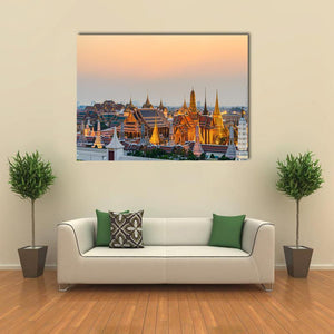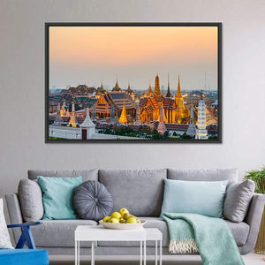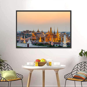 This stunning piece captures the majestic beauty of Bangkok's temple complex and pagodas bathed in the warm hues of a serene sunset. The aerial perspective highlights ornate architecture and gilded spires, making it a captivating addition to any wall.