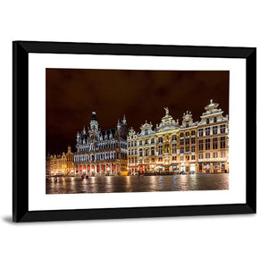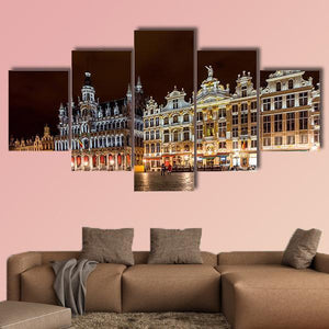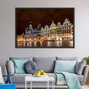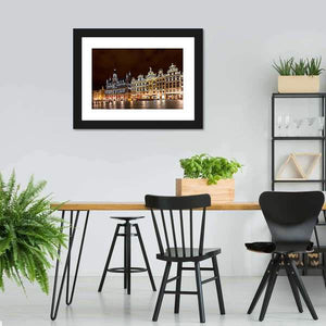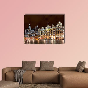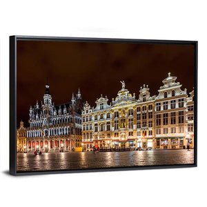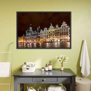 Brussels Grand Place Canvas Wall Art captures the historic city square at night, showing ornate buildings and illuminated windows against a dark sky. The photorealistic cityscape uses yellow, white, brown and black tones and fits well with modern or classic room decor.