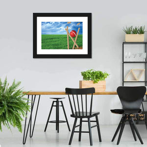 Capture the essence of a cricket game with this vibrant canvas art featuring a lush green field and a dynamic blue sky. The striking contrast of a red cricket ball and white stitching against the backdrop brings a lively atmosphere to any space.