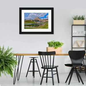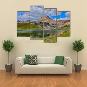 Lake Helen, Canada Canvas Wall Art shows a realistic mountain-and-lake landscape with a snow-patched peak, its reflection in the lake, and fluffy clouds above. Soft blues, greens, tan and grey give the scene a serene, majestic feel that suits modern or nature-inspired rooms.