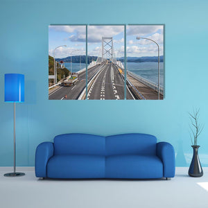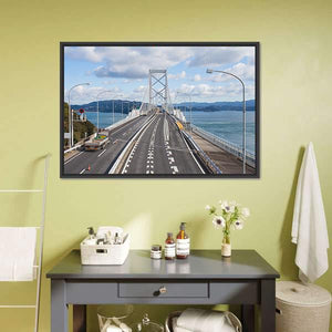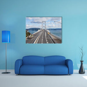 Great Naruto Bridge Canvas Wall Art depicts a photorealistic suspension bridge cutting diagonally across ocean and sky, with cars on the double-deck span and a prominent tower structure. Cool blue, gray, white, green, and yellow tones create a vast, airy mood. Suited to modern or coastal room decor.