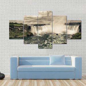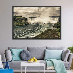This canvas wall art captures the breathtaking power of Niagara Falls, showcasing the waterfall's dramatic motion and mist. Its vintage style and rich palette of browns, greens, blues, and greys create an awe-inspiring atmosphere, making it a striking addition to any room decor.