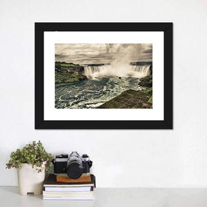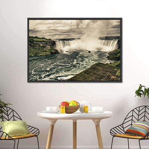 This canvas art captures the dramatic power of Niagara’s waterfalls, featuring a river and clouds amidst lush green banks. The natural palette of greens, blues, and earthy tones brings an invigorating feel, making it a striking addition to any room decor.
