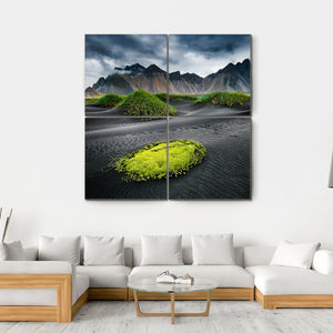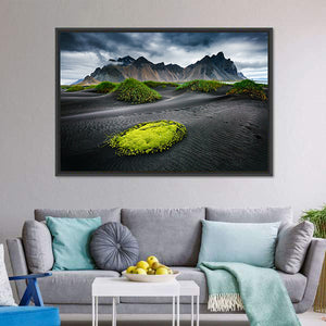 Experience the allure of Iceland's dramatic landscapes with this canvas artwork featuring black sand dunes. The serene combination of textured moss and stormy skies creates a moody atmosphere that enhances any room's decor.
