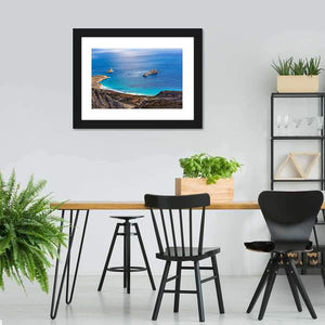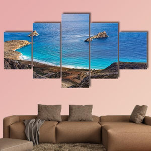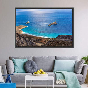 A realistic canvas that captures a high-angle view of Crete’s coastline, showing turquoise water near the shore, rock formations in the sea, and arid hillsides leading to small islands. The calm blue, green and brown palette creates a serene, vast atmosphere. It fits well in coastal or modern room decor where a peaceful landscape is wanted.