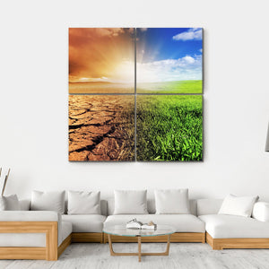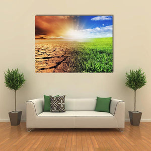 This canvas artwork contrasts dry cracked earth with vibrant green grass, capturing the duality of our planet. Under a dramatic sky filled with sun rays, it evokes a sense of hope amidst the challenges of global warming.