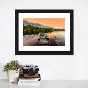 This serene canvas features a peaceful scene of a green canoe and two chairs set on a dock by a tranquil lake. With reflections of trees and sky beautifully captured, it's perfect for bringing a touch of nature into your home.