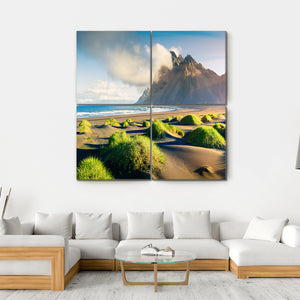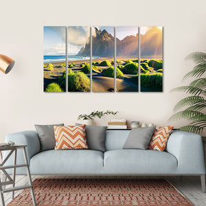 This stunning canvas features a tranquil scene depicting Iceland's majestic mountains and serene grass dunes. Sun rays peek from behind the peaks, enhancing the peaceful atmosphere while contrasting against the dark sand beach.