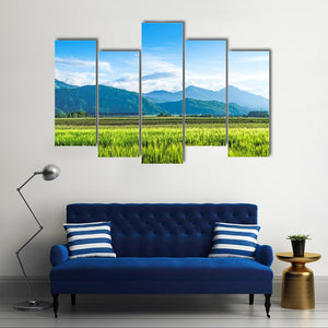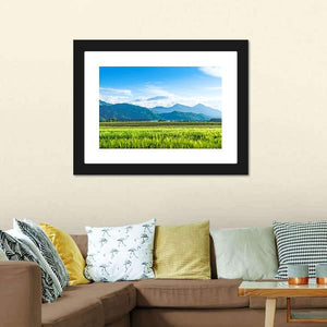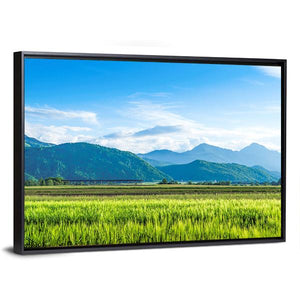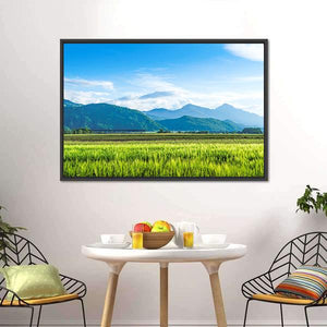 A peaceful landscape of a green field, distant treeline, and mountains beneath a blue sky with soft clouds. The composition emphasizes depth and the rule of thirds to create a calm, serene daytime scene that suits modern or nature-inspired room decor.