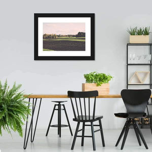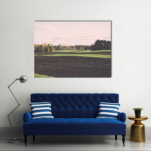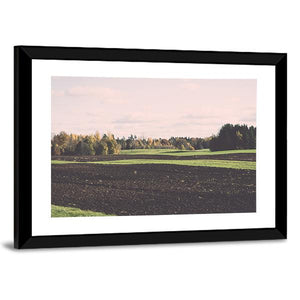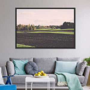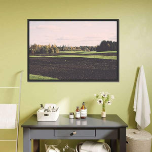 This canvas art features a serene landscape of plowed fields and trees under a cloudy sky. The warm palette of brown, green, pink, and white evokes a peaceful autumn vibe that complements various décor styles.