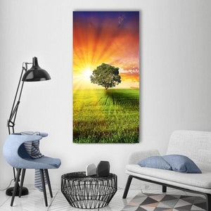 Alone Tree On Green Meadow Vertical Canvas Wall Art