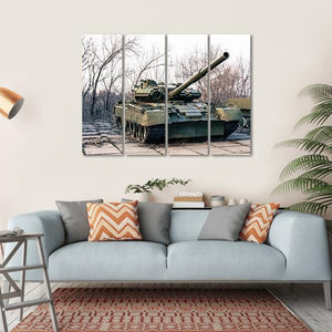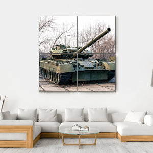 This canvas art features a powerful green military tank, detailed with a long barrel gun and surrounded by bare trees. Its serious vibe and weathered appearance make it a striking addition to any wall decor, perfect for fans of modern military themes.