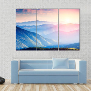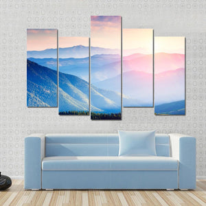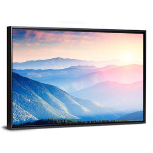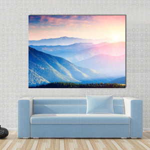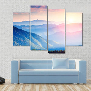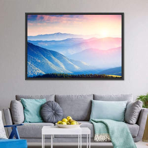 This canvas art captures majestic mountains under a sunburst, creating a serene atmosphere. Featuring layered peaks and misty valleys in soothing blues and soft pinks, it brings the beauty of nature indoors.