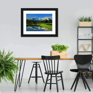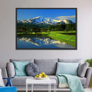 Mt Chokai With Lake Canvas Wall Art shows Mt Chokai in Japan as a snow-capped peak mirrored clearly in a calm lake, with forested shores. Rendered in a realistic style with blues, greens, white, and brown, the scene feels serene and majestic. It suits modern or nature-inspired room decor.