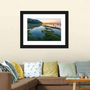 Green Rocks Beach at Bali presents a wide, photorealistic view of a rocky shore and ocean at sunset, with seaweed on the green rocks and coastal cliffs in the background. Soft blues and greens meet warm oranges and yellows as light reflects across the water, creating a serene, peaceful mood. Suited to modern or coastal room decor, it works well in living rooms or bedrooms.