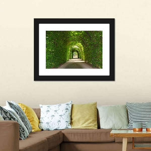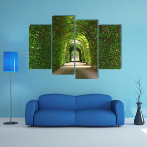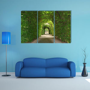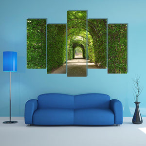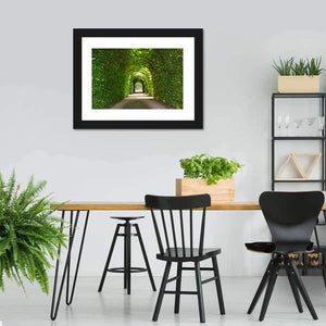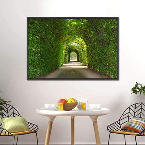 A photorealistic view of a garden path through a green tunnel of trees, with overhanging foliage and arched trellises creating a tranquil, inviting scene. This canvas suits nature-themed or modern rooms as a peaceful focal point.