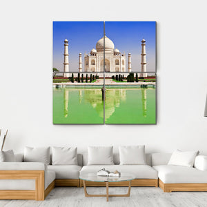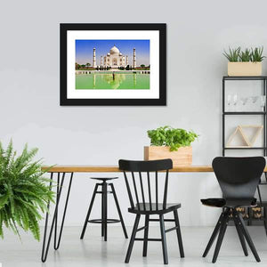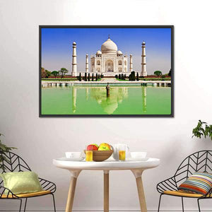 This canvas artwork captures the serene beauty of the Taj Mahal, set against a tranquil reflecting pool and lush gardens. The photorealistic details showcase the iconic four minarets and central dome, creating a majestic atmosphere perfect for any space.