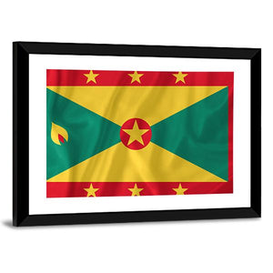 This canvas shows the Grenada flag in a bold, graphic style, highlighting its red, green and yellow palette along with the star and flame-like symbols. The symmetrical composition lends a strong, nationalistic presence that suits modern rooms and wall decor. Use it where a vivid flag piece can add color and character.