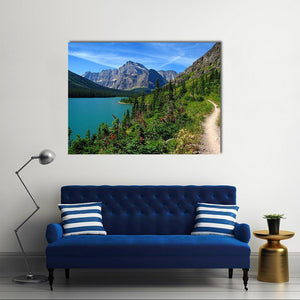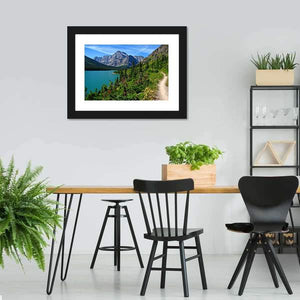 Experience the serene beauty of Lake Josephine with this landscape canvas art. Featuring a turquoise lake surrounded by snow-capped mountains and coniferous trees, this artwork captures the vastness of nature, making it a perfect addition to your home decor.