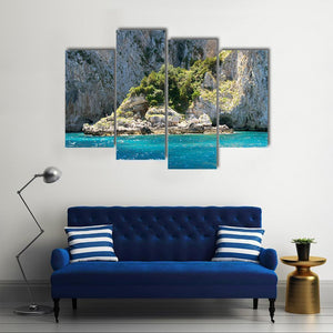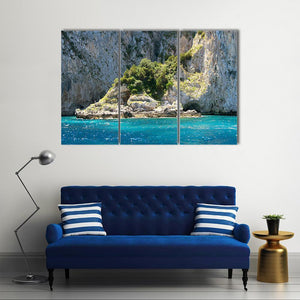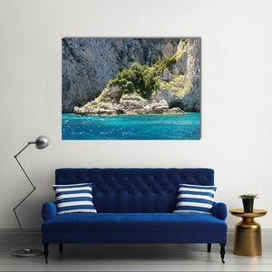 This canvas wall art captures the serene beauty of coastal cliffs and choppy ocean waters, framed by luscious greenery. Its vibrant blue and green palette brings a touch of nature's tranquility to your space.