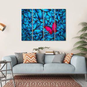This canvas wall art features a captivating group of butterflies, showcasing one prominent pink butterfly against a backdrop of many blue butterflies. The vibrant colors and modern style bring life to any space, making it a delightful addition to your decor.