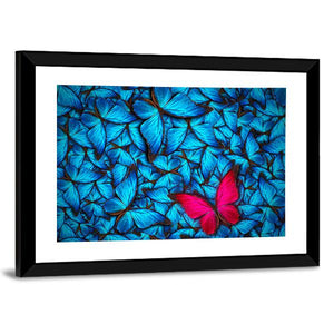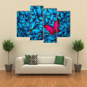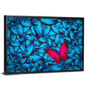 This canvas art features overlapping blue butterflies with a striking pink butterfly standing out, creating a vibrant and chaotic atmosphere. Perfect for adding a touch of modern, abstract charm to your space.