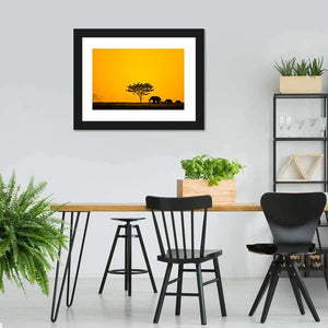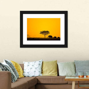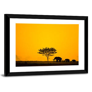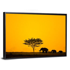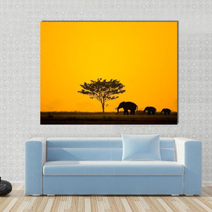 This canvas features a serene scene of three elephants walking in a line against a tranquil savanna backdrop. The silhouette of a lone tree adds to the majestic atmosphere, making it a perfect addition to any nature-themed decor.