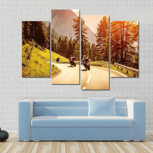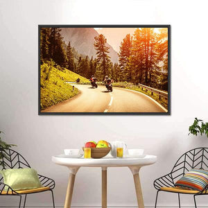 This canvas art features a group of motorcyclists riding along a winding road nestled between mountains and forests. The vibrant palette of greens, yellows, and browns evokes a sense of adventure and freedom in a scenic landscape.