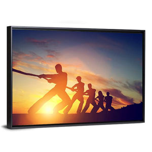 This canvas art captures the dynamic silhouettes of individuals engaged in a tug of war against a vivid sunset backdrop. The energetic composition, painted in shades of orange, blue, and purple, evokes feelings of determination and unity, making it an inspiring addition to any space.