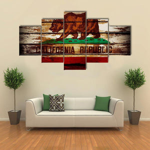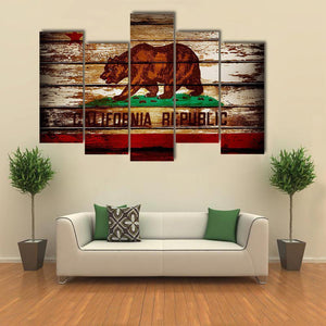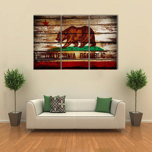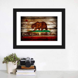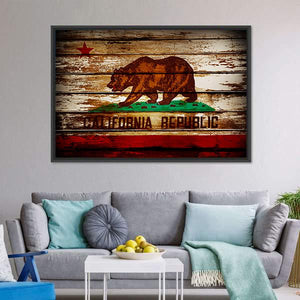 Featuring the California Republic bear and star in a grunge, vintage treatment, this canvas print pairs a wood-plank texture with a warm palette of brown, green, red, white and yellow. The rule-of-thirds composition gives the piece a bold, rustic, patriotic feel that suits house and room decor with rustic or modern styles.