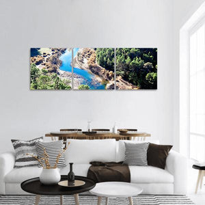 Aerial panoramic view of the Guadalquivir River in Spain, showing a winding, vibrant blue river through dense green forest and rocky, tan banks. The scene feels serene and expansive, with natural tones of blue, green, brown and gray. Works well in modern or nature-focused rooms such as living rooms, studies, or hallways.