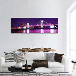 A panoramic cityscape of the Gwangan Bridge at night, showing illuminated cables, a glowing skyline, and reflections on the water. The purple and pink palette creates a vibrant, electric metropolitan mood that works well in modern living rooms and contemporary offices.