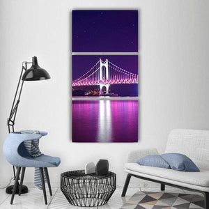 A canvas showing a bridge beneath a starry night sky, rendered in dreamy purple and pink tones with white highlights and deep black contrast. The symmetrical composition emphasizes the bridge and the lights reflected on the water, creating a vibrant yet serene modern scene. Suited to contemporary rooms and modern wall decor.