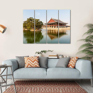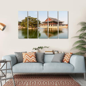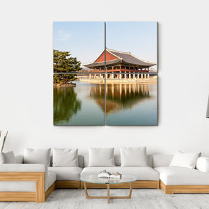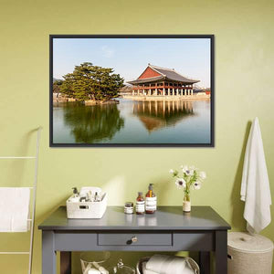 This serene canvas features Gyeongbokgung Palace, showcasing a beautiful pavilion framed by a tranquil pond and a graceful pine tree. The peaceful reflections in the calm water evoke a picturesque atmosphere, making it a perfect addition to any space.