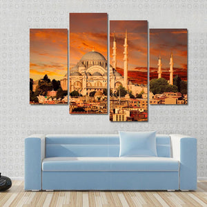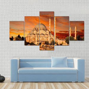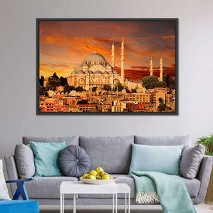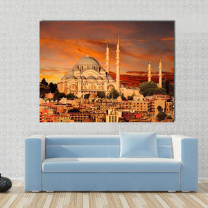 This canvas art captures the majestic Hagia Sophia against a vibrant sunset sky. The warm orange and gold tones highlight the iconic minarets and dense cityscape of Istanbul, creating a dramatic and awe-inspiring atmosphere.