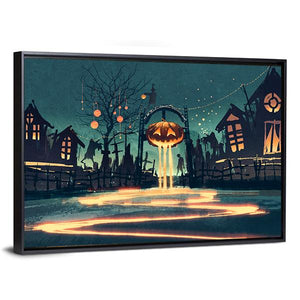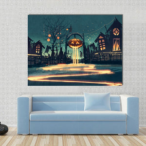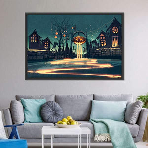 This Halloween Night Canvas Wall Art captures a spooky scene featuring a glowing pumpkin in the foreground, set against a mysterious backdrop of a haunted house. Its dark blue, orange, and yellow palette evokes the eerie atmosphere of Halloween, perfect for adding a touch of seasonal charm to your decor.