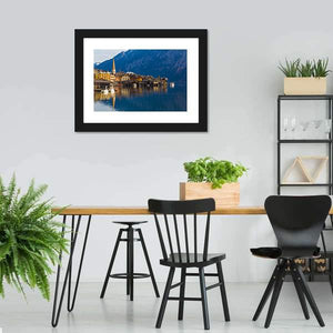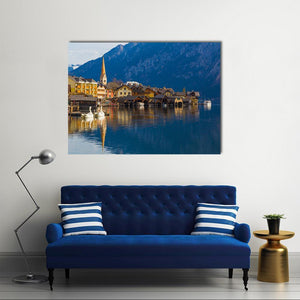 This canvas wall art depicts the charming village of Hallstatt, captured in serene detail. With its picturesque lake, swans, and mountains, it brings a peaceful atmosphere to any space.