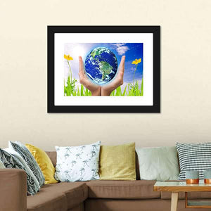 Hands cupping Planet Earth sit above grass and flowers, sunlight filtering through clouds for a hopeful, nurturing feel. This modern canvas uses green, blue, white and yellow tones with a rule-of-thirds composition to keep the image peaceful and balanced. It works well as room decor in a contemporary home or office.