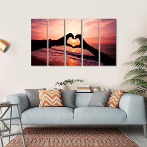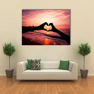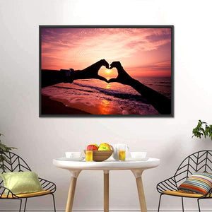 This romantic canvas art features a beautiful silhouette of hands forming a heart against a serene sunset over the ocean. With its warm hues of pink, orange, and purple, it evokes feelings of love and tranquility.