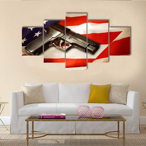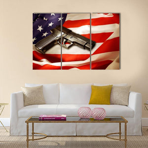 This striking artwork features a close-up of a metal pistol resting on a rippling American flag. The bold use of red, white, and blue creates a patriotic and still atmosphere, making it a captivating addition to any decor.